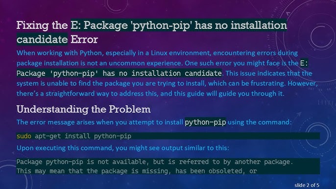 Over the years, Python has witnessed tremendous growth in its user base, making it one of the most popular languages for developers. A significant factor contributing to this popularity is its robust ecosystem that includes a repository of software called PyPI (Python Package Index), and the package installer pip. Pip is specifically designed to install packages from the PyPI repository. However, often users face problems while trying to install pip in their systems with the common error being “E: Package ‘python-pip’ has no installation candidate”.