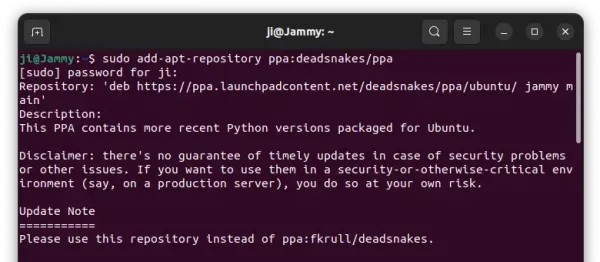 For more on this, check out ‘Deadsnakes’, where the owners specify which versions of Ubuntu are supported and frequently asked questions are addressed. It’s a fantastic resource for understanding the PPA better and troubleshooting common problems.If you encounter difficulty in adding Personal Package Archives (PPAs) from Deadsnakes to your Ubuntu system, it is often due to a few common issues: