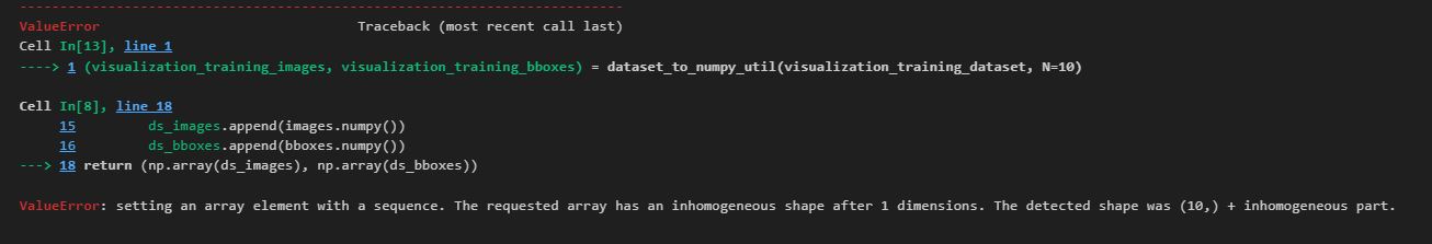 | Requested Array has an Inhomogeneous shape after 1 Dimensions | There is inconsistency in the shape of the array after the first dimension. | All dimensions of your array should have consistent or even lengths/sizes. |