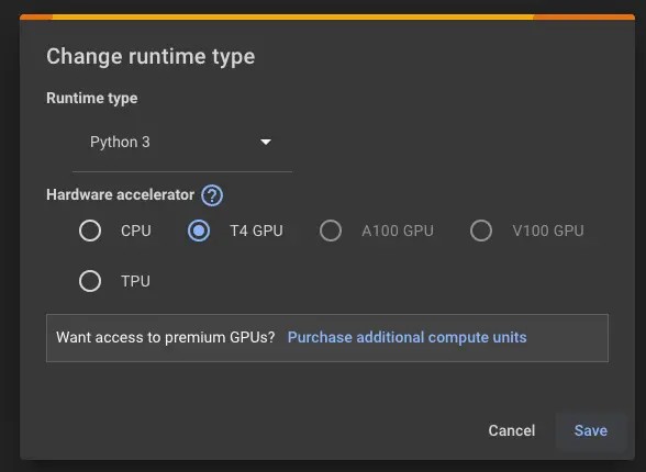 2. **Change the Runtime Type**: Adjusting the runtime type often changes the allocated GPU. Navigate to `Runtime` -> `Change runtime type` and under the `Hardware accelerator` section, choose `GPU`. Run the check again for the allocated GPU model, refresh if desired model is not allocated.