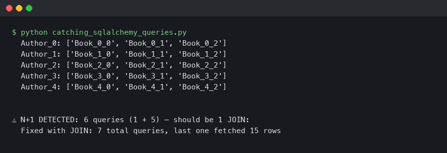 This is why catching the pattern requires counting queries per logical operation, not just profiling individual statements. SQLAlchemy’s relationship loading documentation covers the available eager-loading strategies (joinedload, subqueryload, selectinload) that eliminate N+1 patterns, but you need a detection mechanism to know where to apply them.